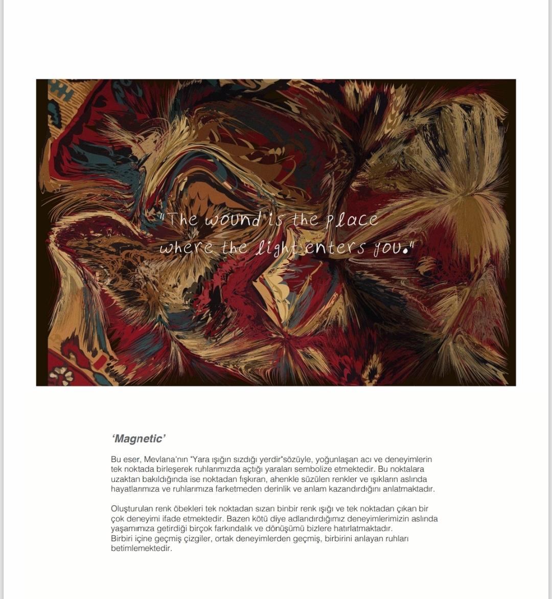 İzlerini kaybetmeye başlamış dokuları ve motiflerimizi hatırlatmanın en önemli noktası aslında mesajın kendisi. Hızlı ve kaotik yaşadığımız bu çağda insanların farklı formlarda bu dokuları, sözleri ve motiflerin birleşimini görüp yeniden benimsemesi ve o ağa tekrar bağlanmasını sağlamak…Eserlerimi sadece bir tablo değil, bir “mesaj taşıyıcısı” olarak görüyorum. Bu mesajların sınırlar ötesinde başka insanlara ulaşıp bir his belleği yaratacağına inanıyorum.