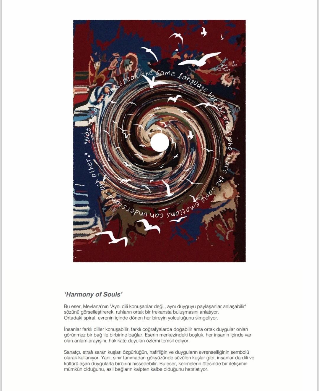 Mevlana’nın bir sözü/cümlesinin bir kilim/halı deseni ile buluşmasını beklemiyordum ki…Buluşmakla kalmamış, o söz/o cümle, o desenle konuşuyor. “Cantürk’ün eserlerinde motifler sadece desen değil, birer anlatı taşıyıcısı. Her form, geçmişin dokusunu bugünün estetiğiyle yeniden örüyor.” Cantürk’ün sabırla işlenmiş detayları, anlamın da sürdürülebilir olabileceğini gösteriyor.”